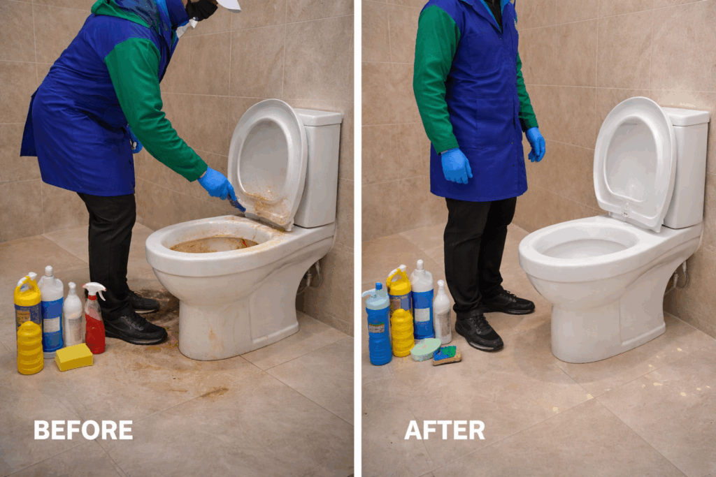 Experience the ultimate in bathroom hygiene with our professional toilet cleaning service.Bathroom cleaning services involve sanitizing and disinfecting fixtures like toilets, sinks, and showers, deep scrubbing tiles and floors, and cleaning surfaces such as mirrors and countertops. These services also address tough issues like soap scum, limescale, and grout stains, and may include tasks like polishing fixtures, and emptying trash. Professional services often go beyond basic cleaning, using specialized tools and products to ensure a high level of hygiene, and some even offer deep-cleaning treatments for more thorough sanitization.
